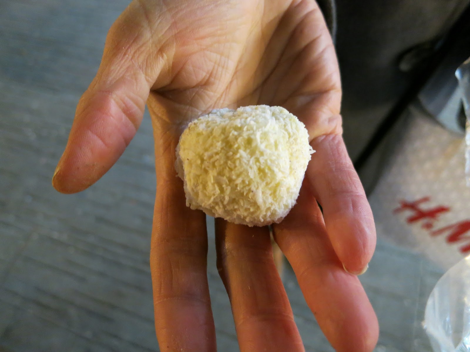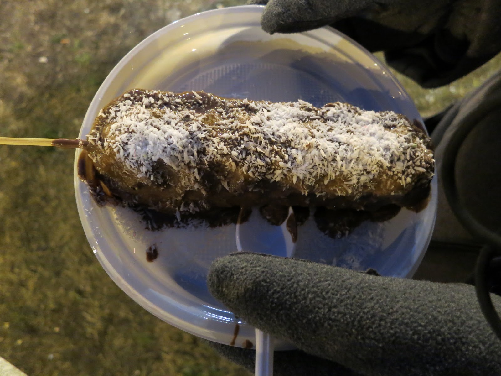 chocolate covered waffle on a stick, with sweetened coconut on top. |